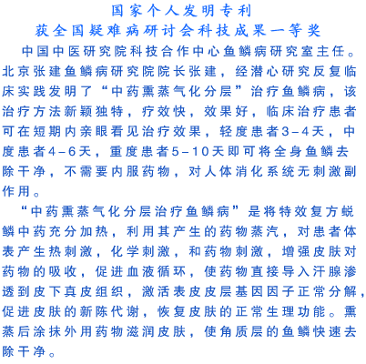 张建院长自1999年 4月正式将中药熏蒸疗法治疗鱼鳞病应用于临床,至2002年底经她治疗并建立病历档案的有千余例。患者大部分都是门诊治疗,一般轻者 3-5次、重者5-10次治疗即能将全身病灶去除干净。在中药熏蒸的治疗过程中,对不同类型的病人熏蒸治疗的方法、时间各不相同。如:1-3型的病人,可采用重度疗法,在短期内很快去除鱼鳞屑。一般病人经3-7次治疗后病灶即会消退。但 4型即大泡型病人,因皮肤一般易溃烂、易感染,治疗不善有可能导致败血症的发生,对这类病人张建院长采取了特殊的治疗方法,治疗时间应延长一些,同样取得了良好的治疗效果。