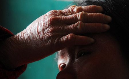被先天性鱼鳞病折磨了35年的陈育红,整日躲在阴暗的房间里,严重蜕皮使她的手皱纹满布。图 记者刘艳